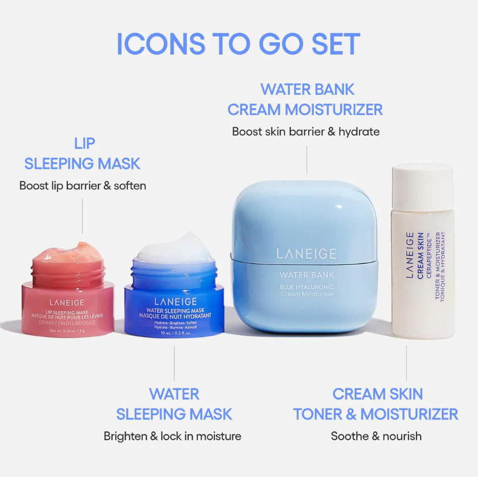 Qué es: Descubre lo mejor de LANEIGE en este set de edición limitada que incluye cuatro minis imprescindibles: Cream Skin Toner & Moisturizer, Water Bank Blue Hyaluronic Cream Moisturizer, Water Sleeping Mask y Lip Sleeping Mask en Berry para la mejor rutina de cuidado de la piel coreana.