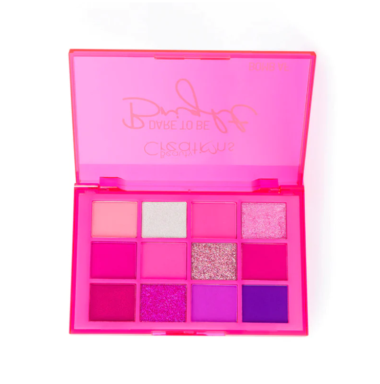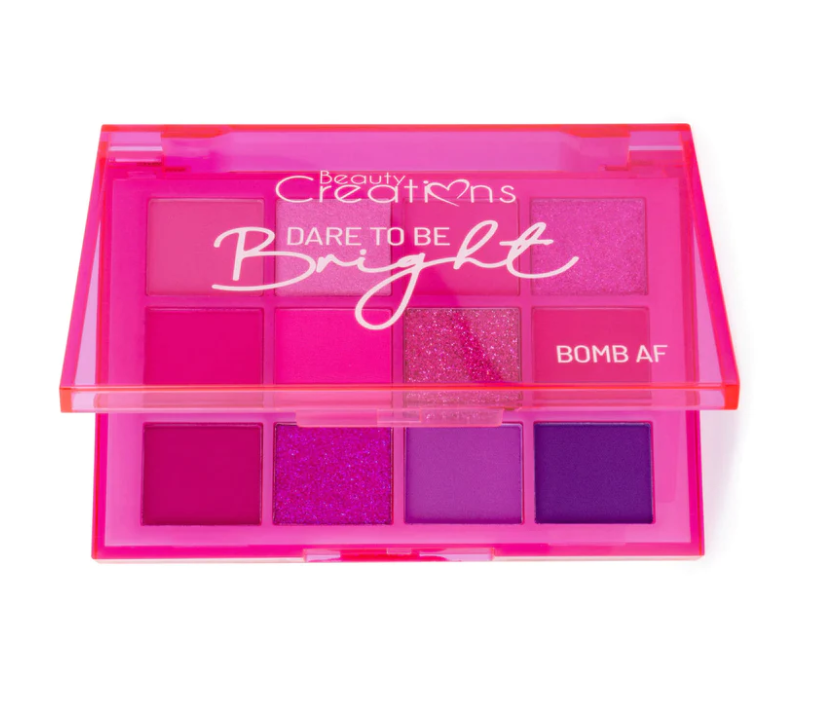 Paleta de sombras de ojos BOMB AF de Beauty Creations de 12 tonos, mezcla perfecta entre mates y brillos prensados para un look perfecto, tonos de rosa a morado.