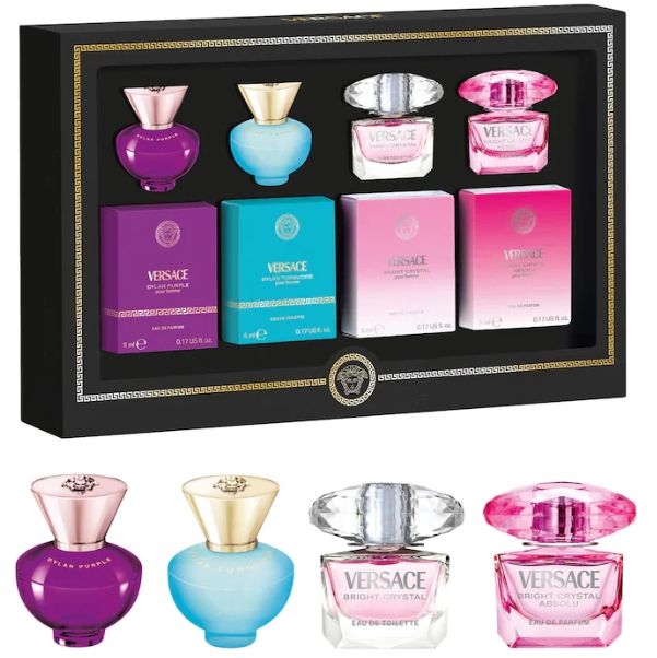 Descripción del set: Esta es la icónica colección de fragancias para mujeres de Versace. Incluye el Dylan Purple Eau de Parfum Deluxe Mini, el Dylan Turquoise Eau de Toilette Deluxe Mini, el Bright Crystal Eau de Toilette Deluxe Mini y el Bright Crystal Absolu Eau de Parfum Deluxe Mini.